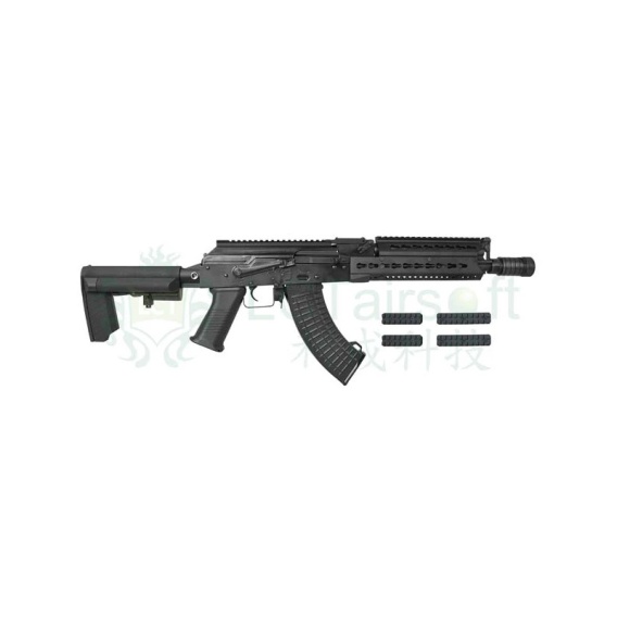 AK LTS Keymod to piękna replika standardowego rosyjskiego karabinu szturmowego AK-74M, umieszczona w nowoczesnej obudowie. Korpus i elementy sterujące wykonane są ze stali, a kolba z wytrzymałego polimeru. Przedramię wwersji Keymod o długości 9,5 cala, z nowoczesną, przesuwną kolbą, z miejscem na akumulator. Kompensator typu Pig. Po lewej stronie karabinu znajduje się szyna boczna, na której można umieścić lunetę celowniczą lub kolimator. Broń wygląda solidnie i jest nie do odróżnienia od oryginału. W zestawie znajduje się magazynek wsuwany.